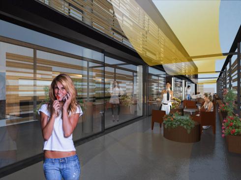La testata dell’edificio dedicato alla ristorazione presenta una vetrata a doppia altezza che denuncia uno dei due ingressi principali e apre la vista dell’interno del locale.